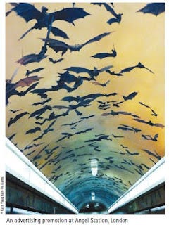 We get a few "odd" phone calls at BCT but in 2014 one particular call got my heart racing when the voice on the phone said “There are bats at Angel underground station”. My initial excitement was a little more subdued when told the bats were in fact part of an advertising campaign by Bacardi, one of the most famous companies using a bat as its logo. I rushed to see the spectacle that same evening and to be honest was very impressed. The bats were everywhere but the highlight was a tunnel where bats were flying above my head as I walked down.